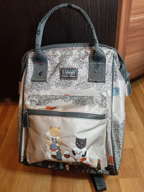 Когда увидела эту сумку-рюкзак в метро у девушки, я была от неё в восторге. По бренду нашла её в магазине и сразу купила. Сумка вместительная, к ней идёт косметичка. Прошита хорошо, швы все ровные и аккуратные. Оказалось, что в этой серии коты, много видов сумок и рюкзаков разных размеров. Теперь хочется к коллекции ещё разных сумочек с котами) В эту коллекцию с котиками я влюбилась)