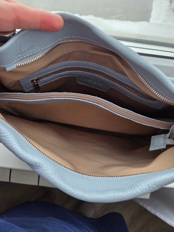 Сумочка из натуральной зернистой кожи серо-голубого цвета. Снаружи на задней стенке карман на молнии, внутри карман на молнии на задней стенке и средник на молнии. Есть длинный текстильный ремень и дае короткие ручки. В комплекте пыльник. Купила с хорошей скидкой, очень довольна