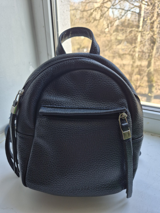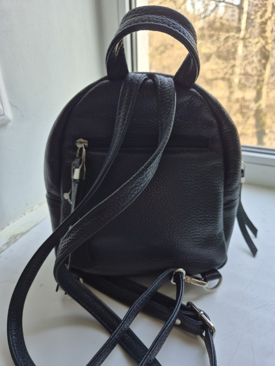 Сумка-рюкзак женская небольшого размера. Рюкзак застегивается на молнию и имеет одно отделение. Лямки рюкзака регулируются по длине. На передней стенке расположен карман на молнии. На задней стенке также есть карман на молнии. Рюкзак на подкладке. Внутри расположены карманы на молнии и накладной карман для мобильного телефона и визиток.