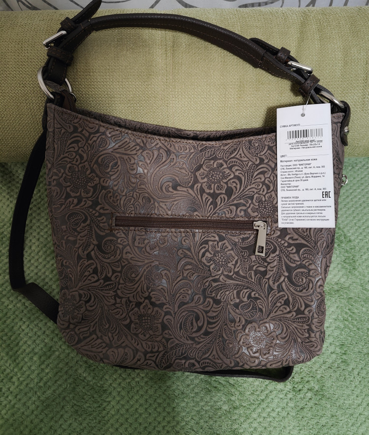 Красивая и качественная сумка. Рисунок тесненой кожи выглядит стильно и необычно. Сумка вместительная, но не выглядит громоздкой. На выбор есть два ремешка: длинный и короткий. Можно прикрепить оба, можно любой на выбор. Достаточное количество карманов для удобного хранения документов и различных мелочей.